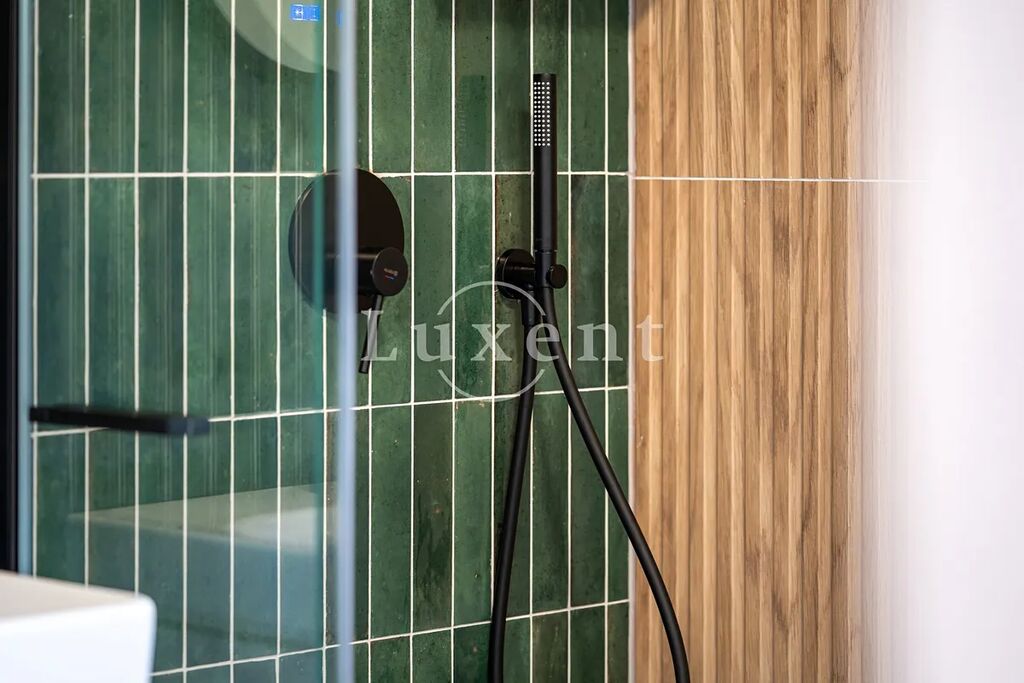 Dispozice a vybavení: dům má tři podlaží vč. částečného podsklepení s technickým zázemím. Dominantou interiéru je velkorysý obývací pokoj s otevřenou kuchyní, jídelnou s masivním dubovým stolem pro 10 osob, ručně vyráběnými kachlovými kamny a přímým vstupem na velkorysou jižní terasu (45 m²). Komfort osobního prostoru zajišťují celkem 4 ložnice (jedna v přízemí, tři v prostorném podkrovním patře s působivými dřevěnými trámy), 3 designové koupelny (hlavní koupelna se samostatně stojící vanou), 2 šatny. Praktické zázemí tvoří vstupní šatna s vestavěnými skříněmi na míru, velkorysý úložný prostor, prádelna a velká technická místnost.