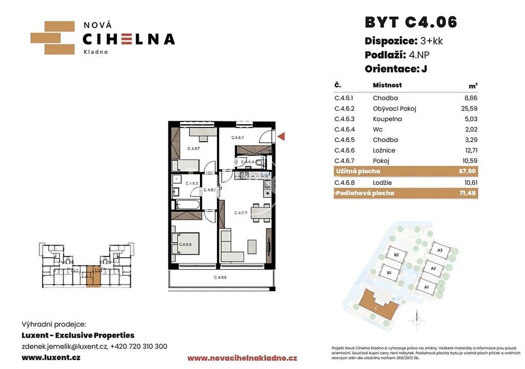 Nabízíme k prodeji byt 3+kk o podlahové ploše 71,48 m² s lodžií 10,61 m² v mimořádně úsporném developerském projektu Nová Cihelna Kladno vznikajícím v městské čtvrti Kladno – Rozdělov.