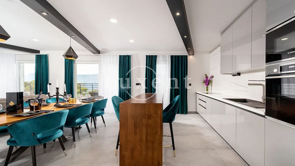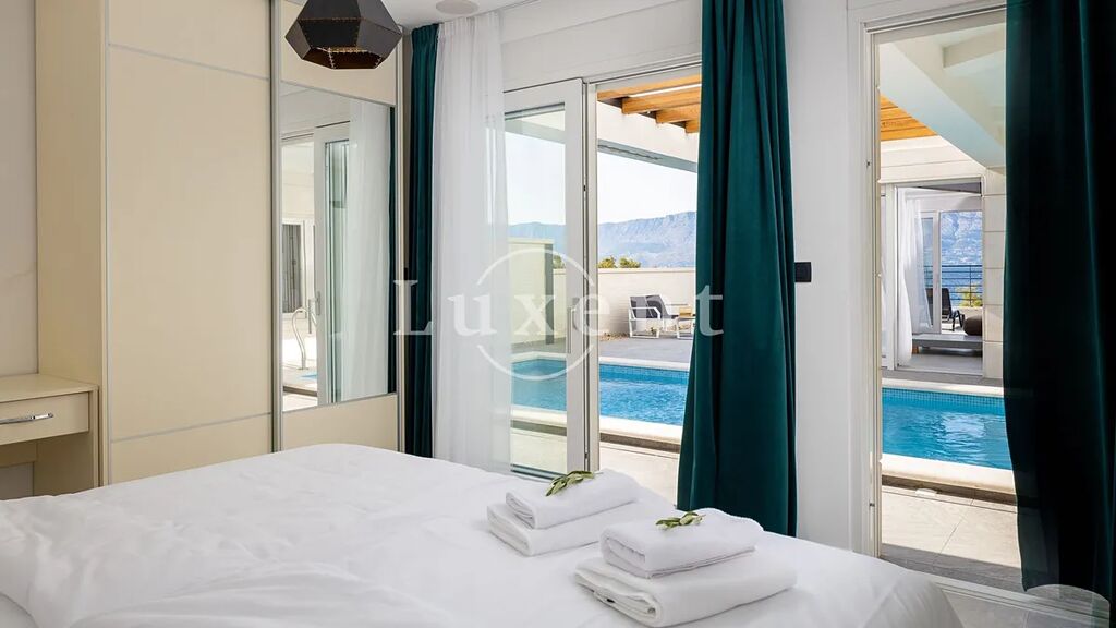 V suterénu se nachází místnost určená pro volnočasové aktivity, prostorná tělocvična a elegantní koupelna. Přízemí domu tvoří světlý, moderně zařízený obývací pokoj propojený s kuchyňským koutem, jedna ložnice, další koupelna a tři terasy – z toho dvě částečně kryté, ideální pro klidné chvíle i letní večery s přáteli. V prvním patře se nachází čtyři ložnice s vlastními koupelnami a dva balkony, které nabízejí panoramatické výhledy na moře a okolní pobřeží.
