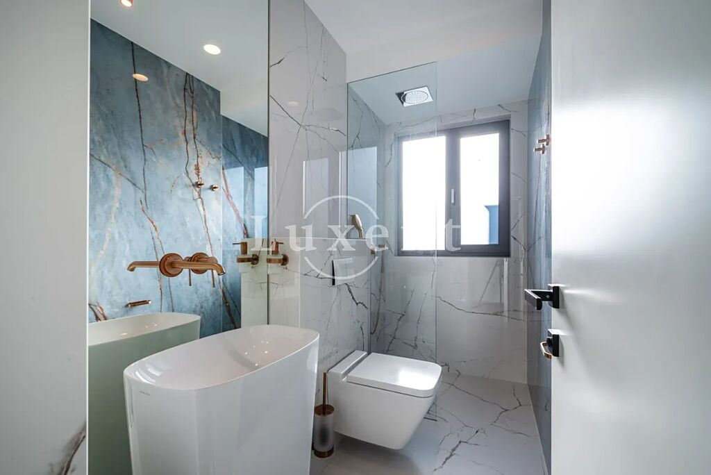 Apartmán o velkosti 144 m2 zahrnuje tři ložnice, otevřený obytný prostor s krbem, kuchyni a jídelnu, dvě koupelny, šatny, a vlastní wellness zónu. Dominantou je prostorná, slunná krytá terasa s bazénem, odkud se otevírá nádherný výhled na moře. Z této soukromé terasy vede přímý vstup na tichou, čistou oblázkovou pláž, která je vybavena venkovní toaletou, sprchou a pozvolným vstupem do moře.