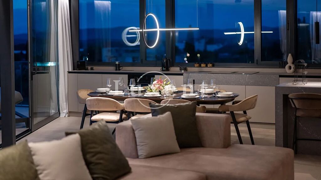 Přízemí nabízí čtyři prostorné a světlé ložnice, z nichž každá má vlastní koupelnu. Všechny pokoje poskytují nádherný výhled na moře, přírodu a olivové háje, které vilu obklopují. V prvním patře se nachází otevřený obytný prostor s kuchyní a jídelnou, rovněž s velkými prosklenými plochami a přímým vstupem na prostornou terasu. Zde je umístěna vířivka, z níž si můžete vychutnat ničím nerušené výhledy a fascinující západy slunce, které jsou pro tuto oblast typické.