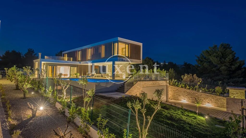 Nabízíme k prodeji jedinečnou moderní vilu s působivým výhledem na moře a okolní ostrovy, situovanou v prestižní lokalitě nedaleko města Primošten. Tato architektonicky výrazná nemovitost se rozkládá na pozemku o velikosti 850 m2 a nabízí obytnou plochu 300 m2, rozdělenou do tří podlaží – suterénu, přízemí a prvního patra.