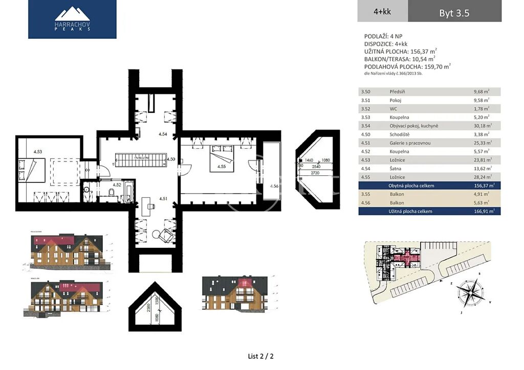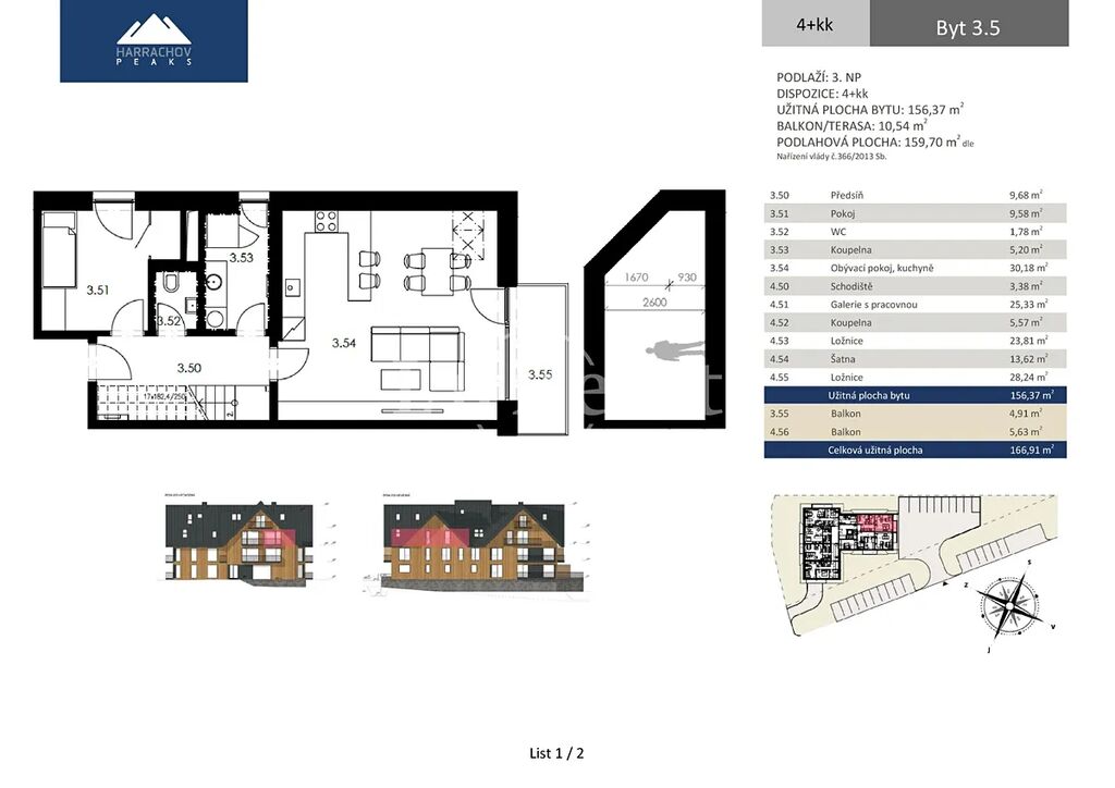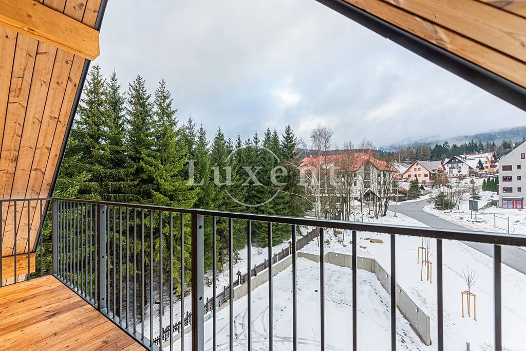 Nabízíme apartmán o dispozici 4+kk ve 3. NP luxusního projektu HARRACHOV PEAKS. Apartmán má obytnou plochu 156,4 m2 (ve světlé podchozí výšce nad 1,2 m je to 152 m2) a celkovou užitnou plochu 166,9 m2 s balkonem (celkem 10,5 m2). Projekt je dokončen a zkolaudován a k prohlídkám byl už otevřen vzorový byt. V suterénu je majitelům k dispozici wellness se saunou a vířivkou a vybavené fitness.