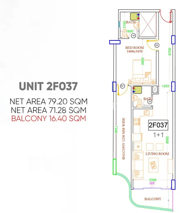 Apartmán má prostornou ložnici se svým vstupem na balkon. Obývací pokoj je spojen s kuchyni a též disponuje balkonem s panoramatickými výhledy na ománské pobřeží a okolní krajinu. Jednotka je zpracovaná ve vysokém technickém standardu a s designovými prvky ve východním stylu. Jednotka je plně vybavená kvalitním nábytkem. Klimatizace je zde samozřejmostí.