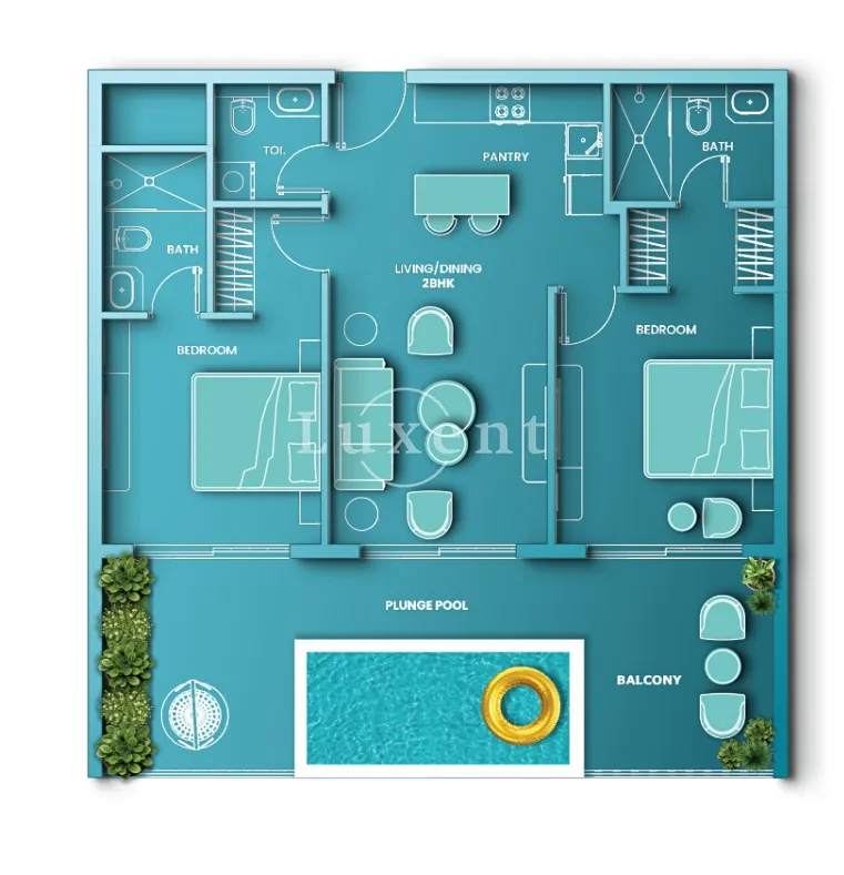 Apartmán má prostorný balkon s soukromým bazénem a venkovním posezením. Jednotka disponuji dvěma ložnicemi, třemi koupelnami a velkým obývacím pokojem s kuchyni. Interiér je nadčasově zařízený. Budoucí majitelé se mohou těšit na fitness a wellness centrum. Rezidentům je k dispozici komunitní park, meditační prostory, sky lounge bar, prémiový business salonek a coworkingový prostor. K apartmánu náleží i parkovací stání. V projektu se klade velký důraz na kvalitu a design.