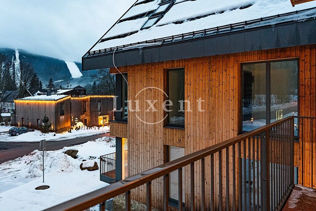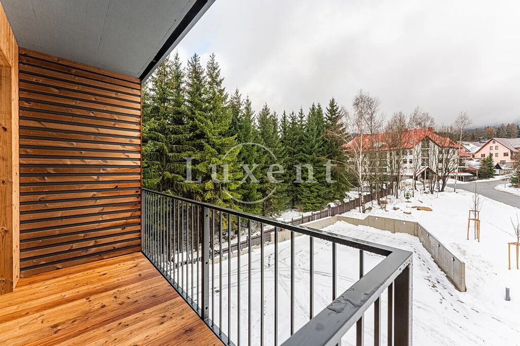 Nabízíme apartmán o dispozici 3+kk ve 3. NP luxusního projektu HARRACHOV PEAKS. Apartmán má obytnou plochu 87,7 m2 (ve světlé podchozí výšce nad 1,2 m je to 81,2 m2) a celkovou užitnou plochu 94,53 m2 se dvěma balkony (4,6 a 6,3 m2). Projekt je dokončen a zkolaudován a k dispozici je už vzorový byt. V suterénu je majitelům k dispozici wellness se saunou a vířivkou a vybavené fitness.