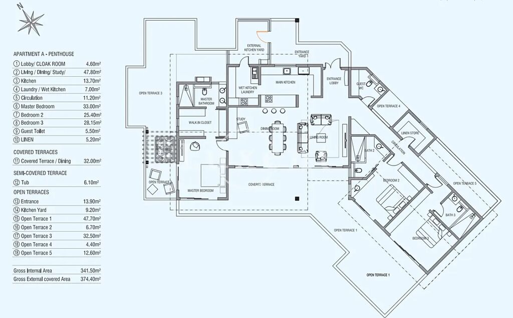 Dispozice bytu o obytné ploše 182 m2 zahrnuje tři ložnice s vlastními koupelnami (33 m2, 25 m2, 28 m2) a terasami. Prostorný obývací pokoj (48 m2) s kuchyní (14 m2) má velké arkýřové okna, skrze které se dostanete na prostorné terasy, které jsou z části zastřešené. Součástí bytu je také prádelna (7 m2), toaleta pro hosty (6 m2), kuchyňský dvorek (9 m2), chodba (5 m2) a spíž (5 m2). K tomuto apartmánu také patří dvě parkovací stání.