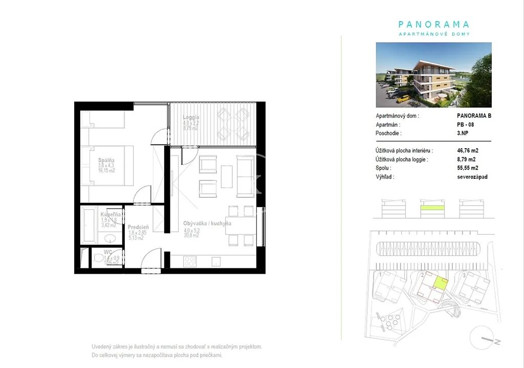 Nabízíme k prodeji byt 2+kk v nové rezidenci Marina Liptov nacházející se v obklopení majestátných vrchů, malebných národních parků a nejdelší slovenské přehrady Liptovská Mara. Byt se nachází ve 3.NP a disponuje obytnou plochou 47 m2 a celkovou užitnou plochou 56 m2. Rozložení bytu nabízí obývací pokoj s kuchyňským koutem, ložnici a koupelnu, k bytu taktéž náleží lodžie 8,8 m2 přístupná z obývacího pokoje i ložnice. Dům má bezbariérový přístup a výtah, ke každému bytu náleží parkovací stání a sklepní kóje, které jsou již zahrnuty v ceně.