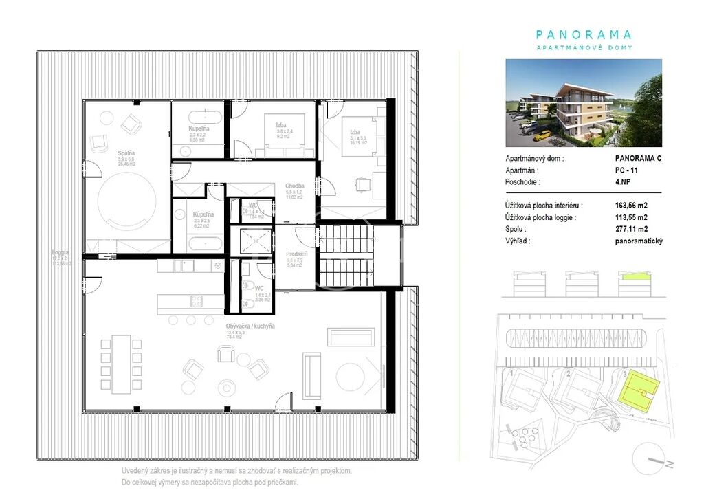Nabízíme k prodeji luxusní penthouse 4+kk v nové rezidenci Marina Liptov nacházející se v obklopení majestátných vrchů, malebných národních parků a nejdelší slovenské přehrady Liptovská Mara. Byt se nachází ve 4.NP, rozprostírá se po celém podlaží a disponuje obytnou plochou 164 m2 a celkovou užitnou plochou 277 m2. Rozložení bytu nabízí prostorný obývací pokoj s kuchyňským koutem a jídelním prostorem, tři ložnice, dvě koupelny a samostatnou toaletu. Kolem celého bytu se rozprostírá lodžie/terasa 114 m2 s jedinečným panoramatickým výhledem do okolí. Dům má bezbariérový přístup a výtah, ke každému bytu náleží parkovací stání a sklepní kóje, které jsou již zahrnuty v ceně.
