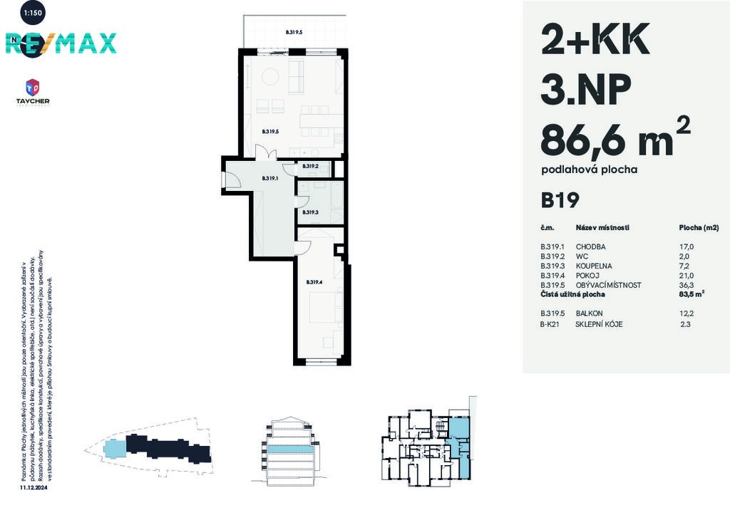 Nabízíme byt B19, 2+KK o celkové ploše 86,6 + 12 m²(balkon), který se nachází ve 3.NP. Byt disponuje velkou vstupní chodbou s možností umístění vestavných skříní. Stejně jako v ostatních bytech je WC odděleno od koupelny. Byt má velkou obytnou místnost s kuchyní (36,3 m2) a přímým vstupem na terasu a prostornou ložnici. V přiloženém půdorysu máte možnost si prohlédnout dispozici bytu, která odpovídá všem moderním standardům. Byt bude standardně vybaven dřevěnou podlahou a v koupelně a WC velkoformátovou moderní dlažbou. Finální materiály je možno samozřejmě s developerem individuálně řešit. Součásti prodejů je sklep o velikosti 2,5 m2.