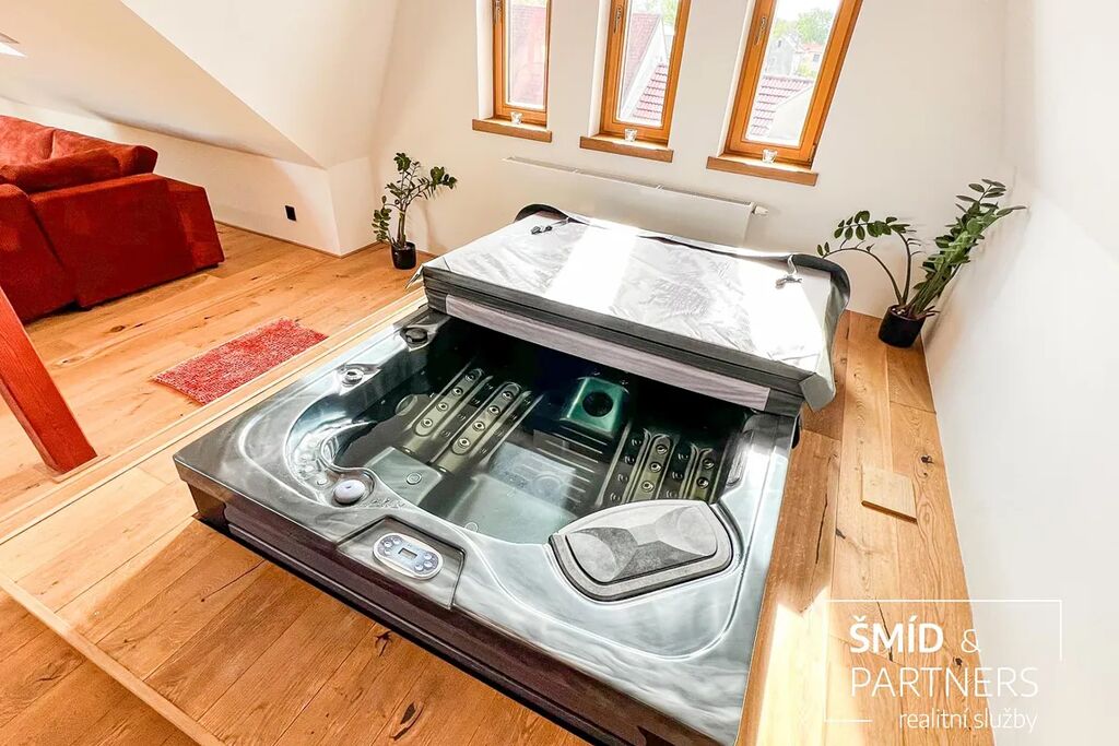 V podkroví vznikl nadstandardní byt o 90 m2, který je svým vybavením určen pro relaxaci a užívání si zaslouženého odpočinku po náročném dni. K tomuto účelu slouží nejen vířivá vana, velká terasa o 20 m2, ale i celkový dojem z bytu, který dodává velký prostor či dřevěné podlahy. V bytě je samozřejmě ložnice, koupelna a WC. U vchodových dveří je sauna, která díky svému umístění může být k dispozici i ostatním obyvatelům domu.