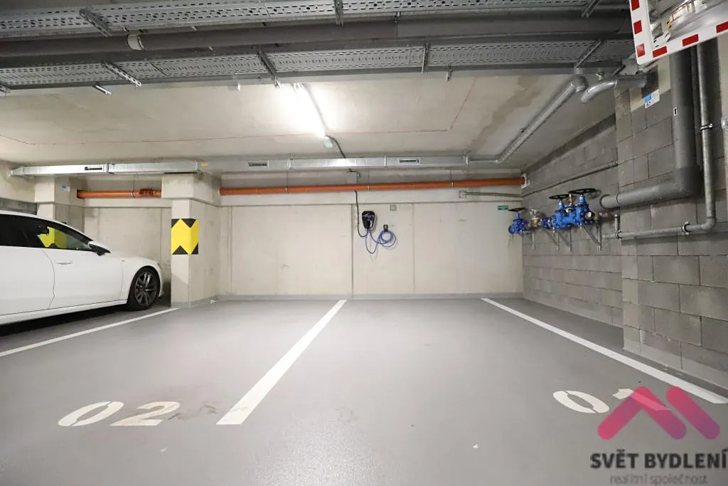 K bytu náleží 2x parkovací stání (osazeno Wallboxem pro nabíjení elektromobilu) a prostorný sklep o výměře cca. 8m2.