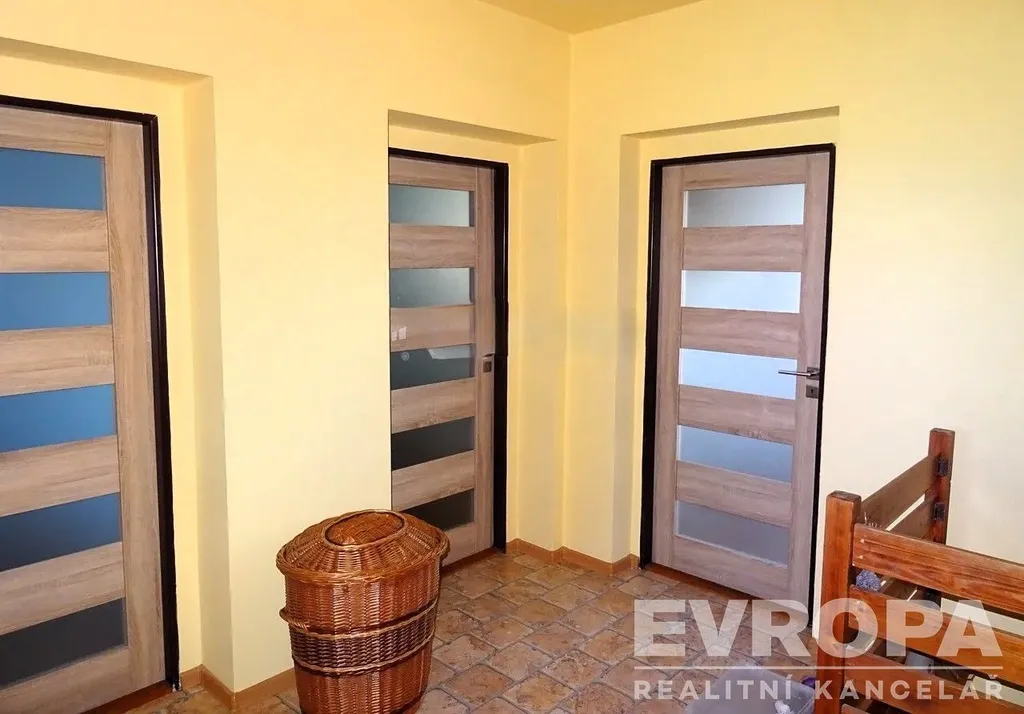 Interiér domu je rozdělen do dvou nadzemních podlaží a jednoho podzemního. V přízemí předsíň, velká koupelna se sprchou a WC, schodiště do patra a hlavní místnostmoderní kuchyň s jídelním koutem a obývací prostor s krbovými kamny. Z obývací části je vstup na zastřešenou velkou terasu s průchodem do zahrady. V patře domu je z chodby vstup do velké koupelny s vanou a WC, dále potom do čtyř samostatných pokojů, z nichž 2 mají vlastní balkony. Celý dům je podsklepený a nachází se zde garáž pro dvě auta, prádelna, technická místnost, spíž, místnost na kola a dílna. Na zahradě najdete nádherný zastřešený vyhřívaný bazén a celoroční vířivku, ohřev zajišťuje tepelné čerpadlo. Zahradu za domem dotváří romantický dřevěný altán.