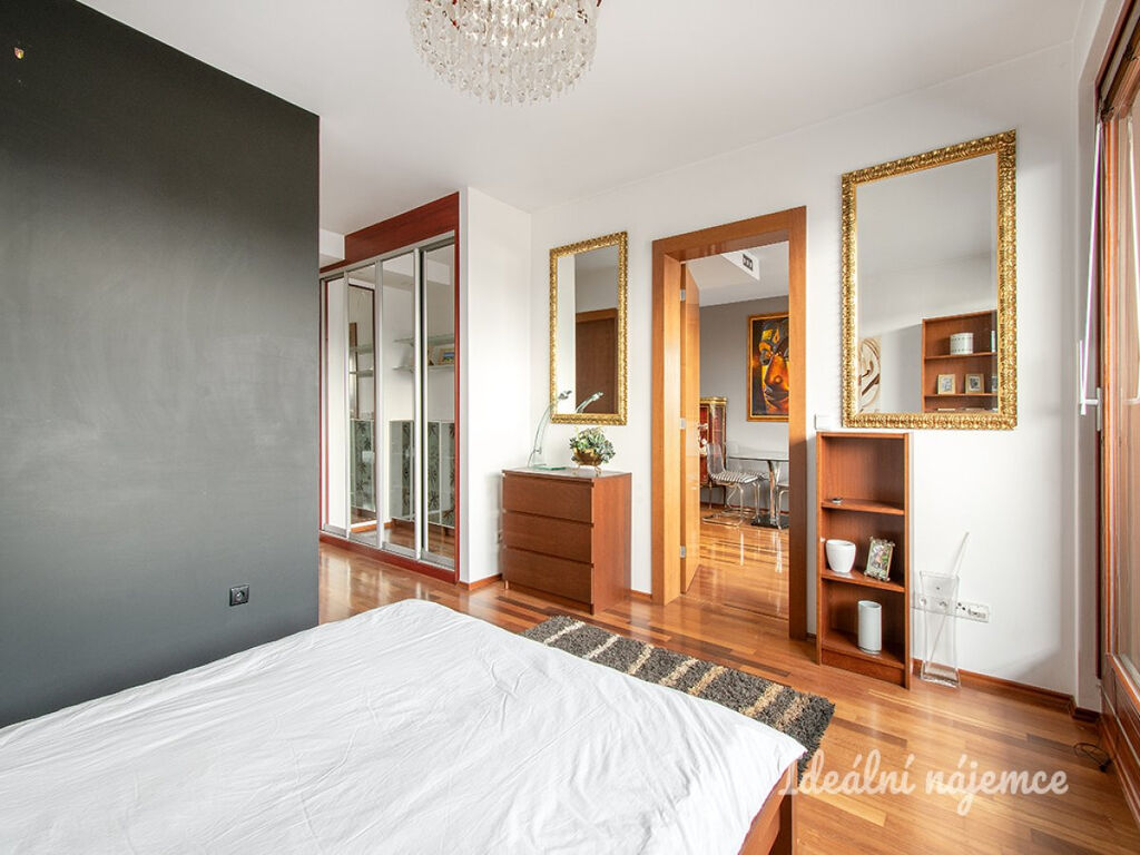 Byt se nabízí plně vybavený designovým nábytkem a kvalitními spotřebiči. Kuchyně disponuje kompletní kuchyňskou linkou vybavenou lednicí, myčkou, elektrickou troubou, varnou deskou, mikrovlnnou troubou, rychlovarnou konvicí a digestoří. Obývací část je zařízena jídelním stolem se 4 židlemi, pohovkou, lampou, konferenčním stolem a televizí. Součástí ložnice je postel, knihovny, komody, zrcadla a vestavěná šatní skříň. Druhou vestavěnou šatní skříň najdeme v předsíni. V koupelně je vana, zrcadlo, koupelnová skříňka, umyvadlo a pračka. Toaleta je umístěna samostatně.