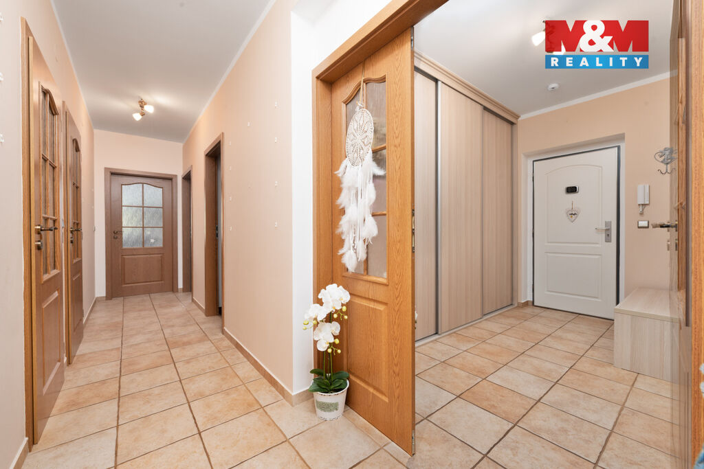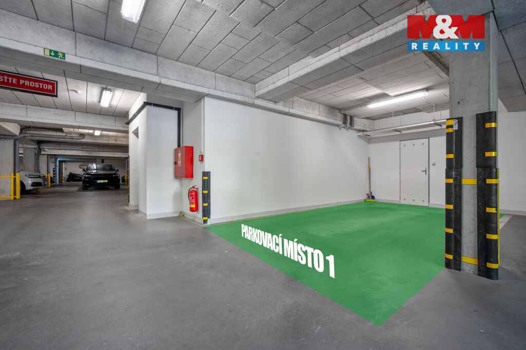 Dispozice zahrnuje dva samostatné pokoje, obývací pokoj spojený s kuchyní, koupelnu, samostatnou toaletu, šatnu a předsíň. K bytu náleží také dva balkóny, dvě garážová stání a dva sklepní prostory.