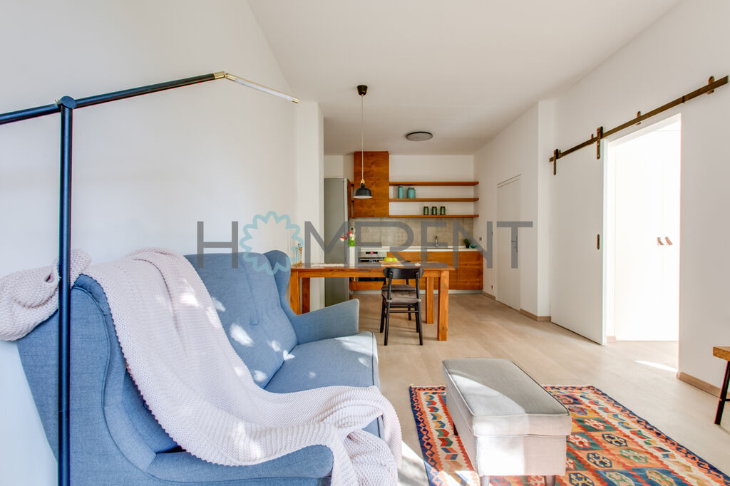 - světlý obývací pokoj s pracovním koutem a vstupem na balkon