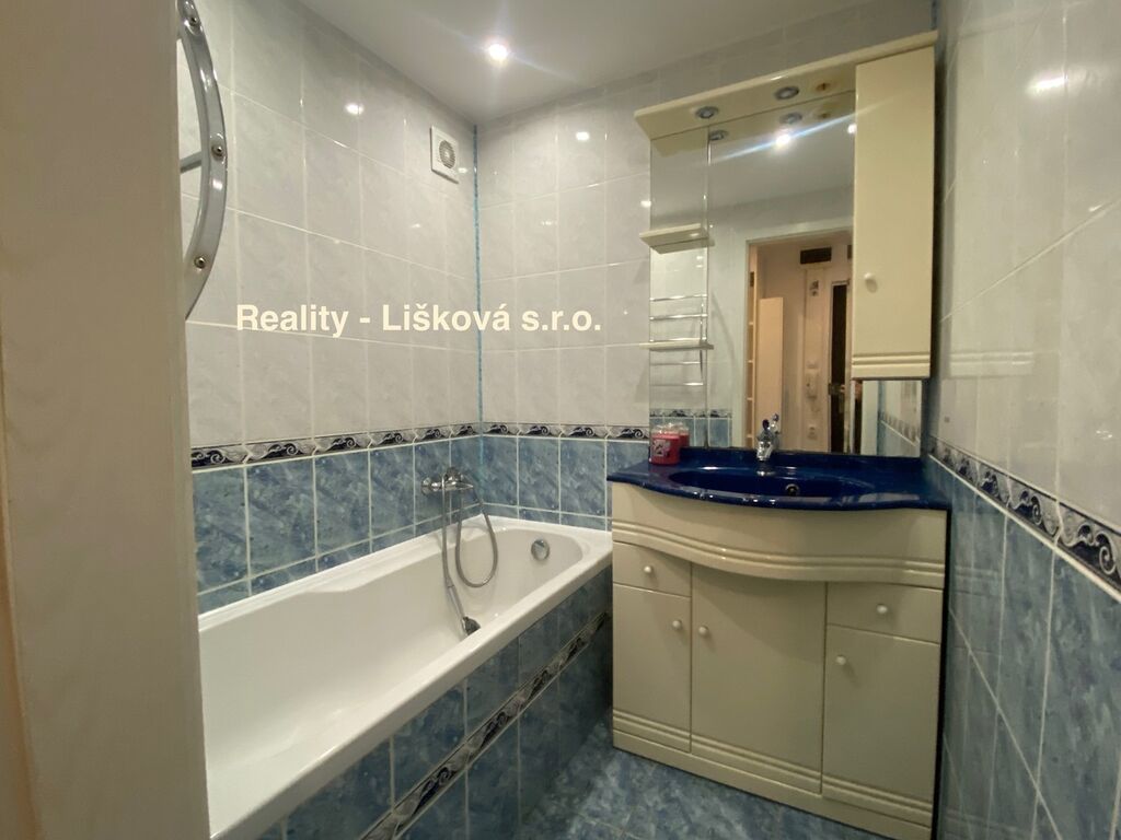 Vyzděné bytové jádro má v koupelně vanu, velké umyvadlo s toaletkou a přípojka na pračku je vyvedena do kuchyňského koutu.