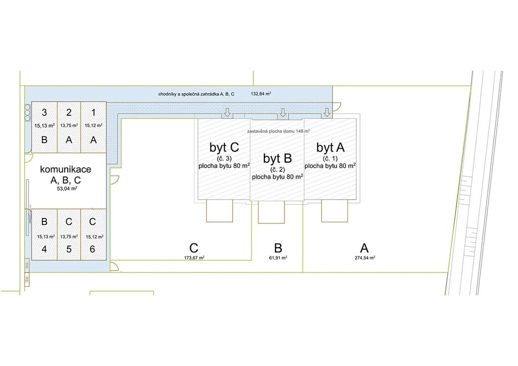 Jedná se o novostavbu rodinného domu (Energetická třída B - velmi úsporná) se třemi bytovými jednotkami. Každá z jednotek je se samostatným vchodem, ke každé náleží vlastní oplocená zahrádka s terasou a pergolou 3x3m s přímím vstupem z obývacího pokoje a zahradním domkem 2x2 m, dvě vymezená parkovací stání na uzavřeném/oploceném pozemku s pojezdovou bránou na DO.