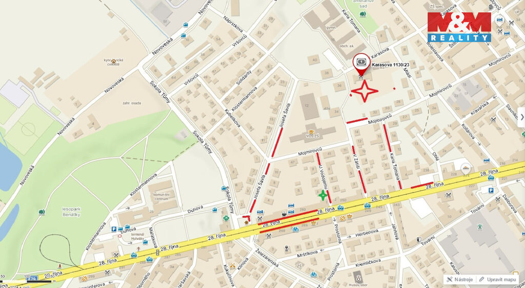 Pronájem pěkného přízemního prostoru s výlohou přímo na hlavní třídu. Celková výměra 40 m². Jedná se o kanceláře v domě jehož fasáda prošla zdařilou rekonstrukcí, ul. 28. října, Ostrava - Mariánské Hory, poblíž tram. zastávky Prostorná / trolejbusová zast. Sokola Tůmy. Hlavní místnost, ideální pro jednání s klienty, je prosvětlena opravdu velkou výlohou - místo pro reklamu máme zajištěno. Tři schůdky nás oddělují od vstupu do druhé části (kuchyňka s místem pro ledničku), dále navazuje zadní místnost s výhledem do zahrady. Součástí pronájmu je samostatné sociální zázemí vč. umývadla. Pronájem bez vybavení. Parkování na ulici. Dále je možnost pronájmu až 3 vyhrazených parkov. míst. Výborná dostupnost i přes MHD. Výhodou je pronájem u solidního majitele. Celkové náklady na kancelář se skládají z inzerovaného nájmu + služby paušálem. Jedná se o zajímavé místo, které je možno obhlédnout přímo z ulice. Počátek pronájmu od 11-12/2025. Makléř doporučuje rezervaci již na první prohlídce.