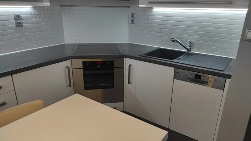 Novému uživateli zůstává k dispozici kuchyňská linka plně vybavena spotřebiči (myčka nádobí, pečící trouba, varná deska, mikrovlnná trouba, pračka se sušičkou, chladnička s mrazničkou, jídelní stůl, židle...), vestavná úložná skříň v obývacím pokoji, vestavný úložný prostor v kuchyni a v předsíni.