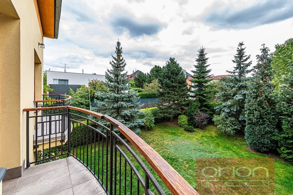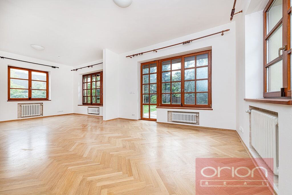 Nabízíme k pronájmu prostornou vilu se zahradou v klidné rezidenční čtvrti v Praze 6 - Břevnov. Celková plocha domu činí 316 m² a nabízí v přízemí vstupní halu, plně vybavenou kuchyň, obývací pokoj s jídelnou a se vstupem na terasu a zahradu, koupelnu se sprchou a samostatnou toaletu. V 1. patře jsou 3 ložnice, (z nichž 2 mají vstup na balkon), koupelna s rohovou vanou a sprchou a samostatná toaleta. Podkroví nabízí 2 ložnice a koupelnu s vanou a toaletou. V suterénu domu se nachází skladovací prostory, koupelna se sprchou, umyvadlem a WC, technická místnost a garáž pro dvě auta. K vybavení domu patří skříně, pračka, internet, satelit a alarm. Na podlahách jsou dřevěné parkety a dlažba. Ve spodním patře jsou venkovní elektrické rolety. K dispozici je udržovaná zahrada o velikosti 403 m². Dům je situován v klidné lokalitě v pěší dostupnosti od parku Ladronka, obory Hvězda nebo Břevnovského kláštera. Krásná lokalita se spoustou zeleně v okolí, 5 minut chůze od tramvajové zastávky s rychlým spojením na metro Hradčanská. V blízkém okolí veškerá občanská vybavenost: obchody, školy a školky, mezinárodní školy, sportoviště, restaurace a kavárny. Autem blízké napojení na městský okruh a dálniční síť.