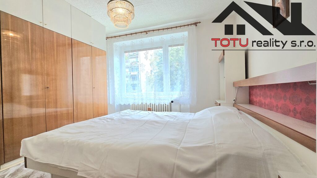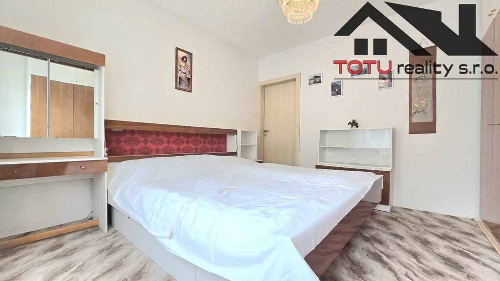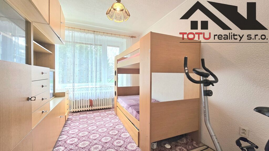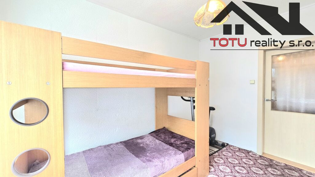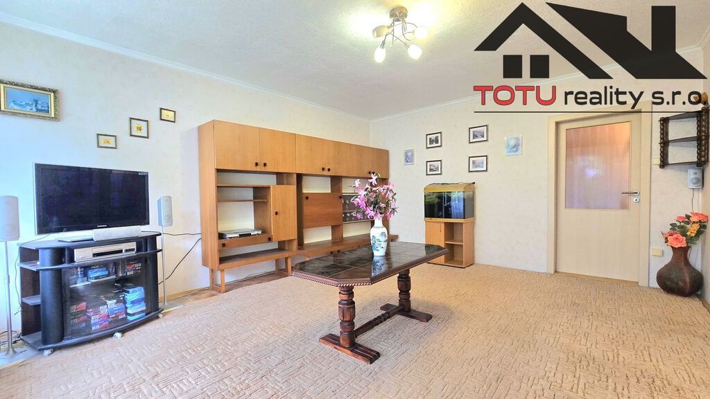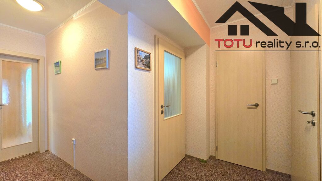 Dispozice bytu: vstupní chodba 11 m2 navazující na kuchyň 9 m2 a velkorysý obývací pokoj 21 m2, ze které je vstup do lodžie 6 m2. Ze vstupní chodby dále pak neprůchozí ložnice 13 m2 a neprůchozí dětský pokoj 9,5 m2. Koupelna s vanou, samostatná toaleta a větší úložná komora 4 m2. K bytu dále patří dvě zděné sklepní kóje.