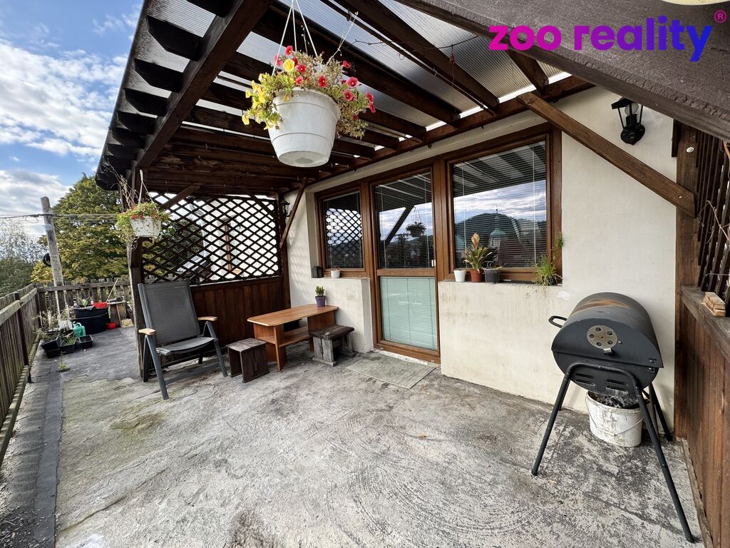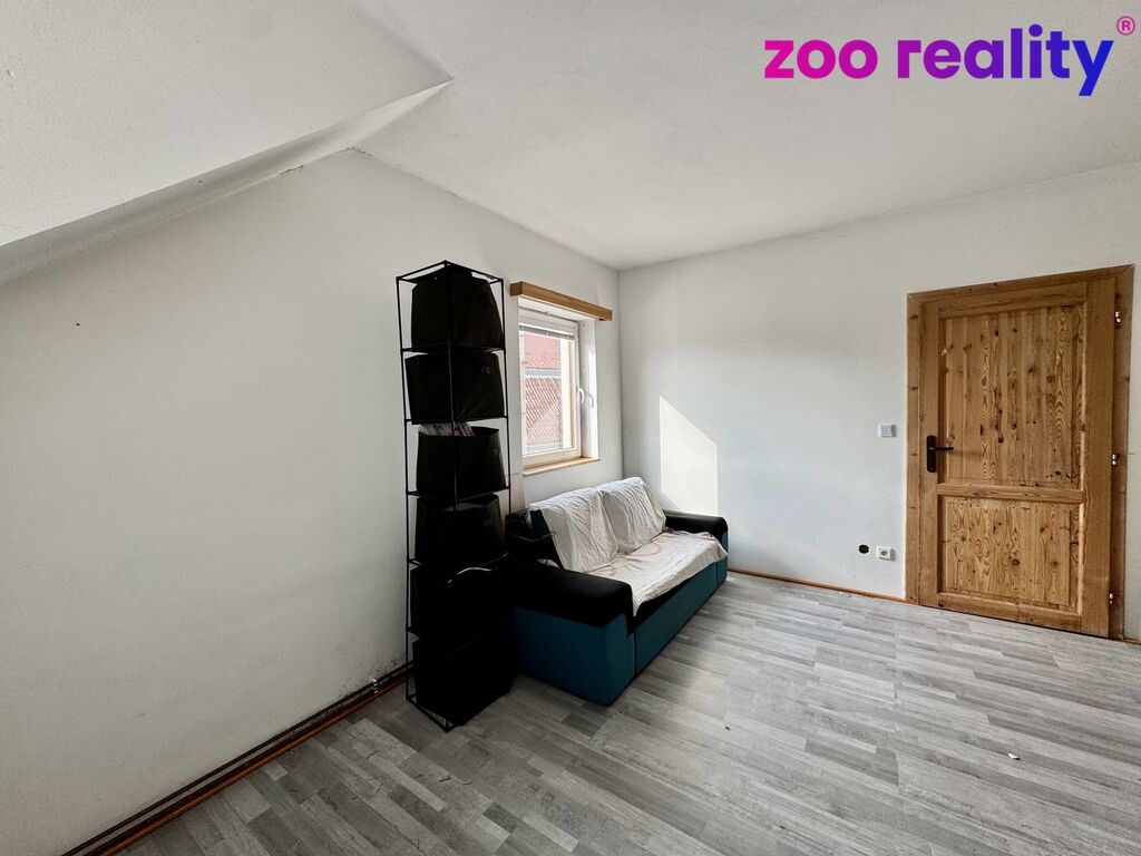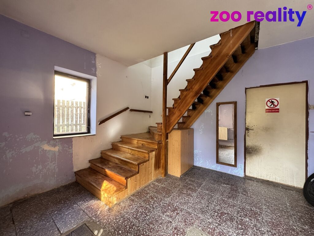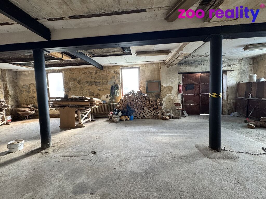 V přízemí domu najdeme nebytový prostor s plechovými vjezdovými vraty, dříve sloužící jako truhlářská dílna se zázemím, jsou tu další 2 místnosti, kotelna a toaleta. Dále pak vstupní předsíň s dřevěnými schody do obytného patra, kde je bytová jednotka o dispozici 3+kk (106 m2) s terasou (55 m2) s pěkným výhledem, na kterou se dostaneme z obývacího pokoje. V koupelně s vanou a umyvadlem je místo i na pračku, toaleta je oddělena.