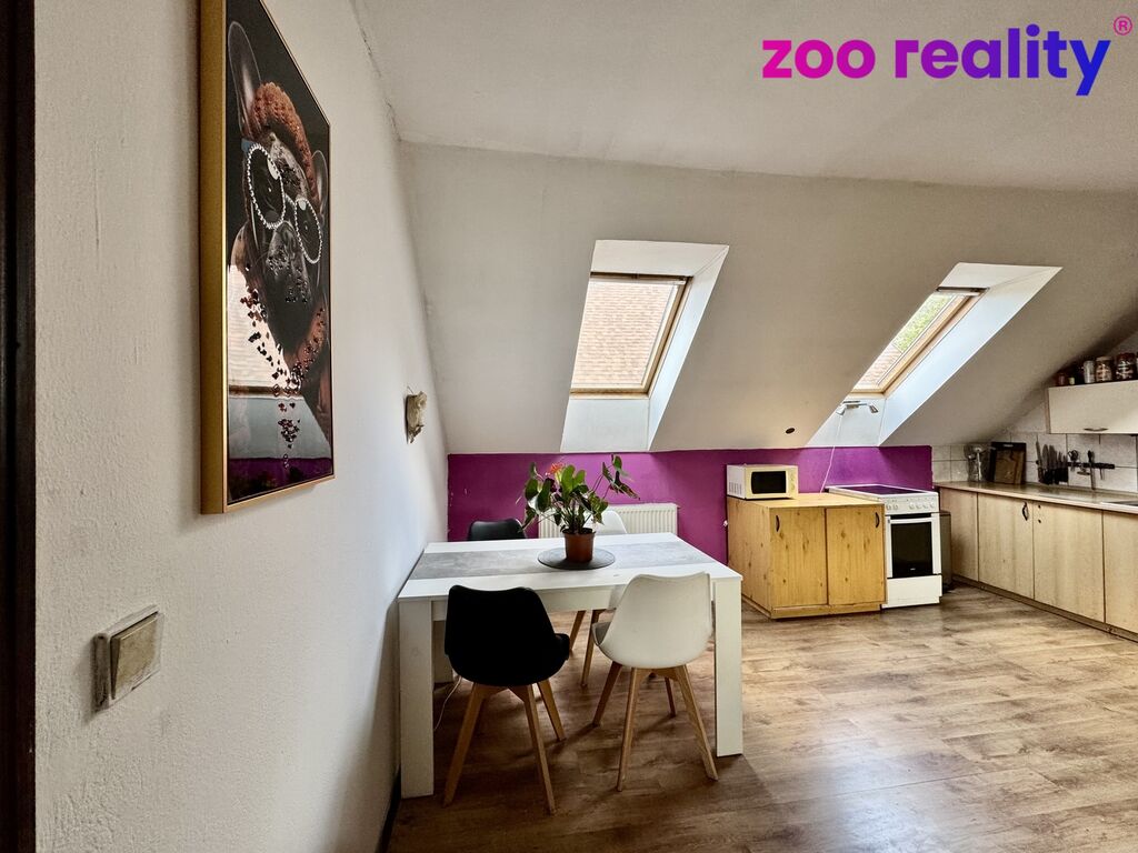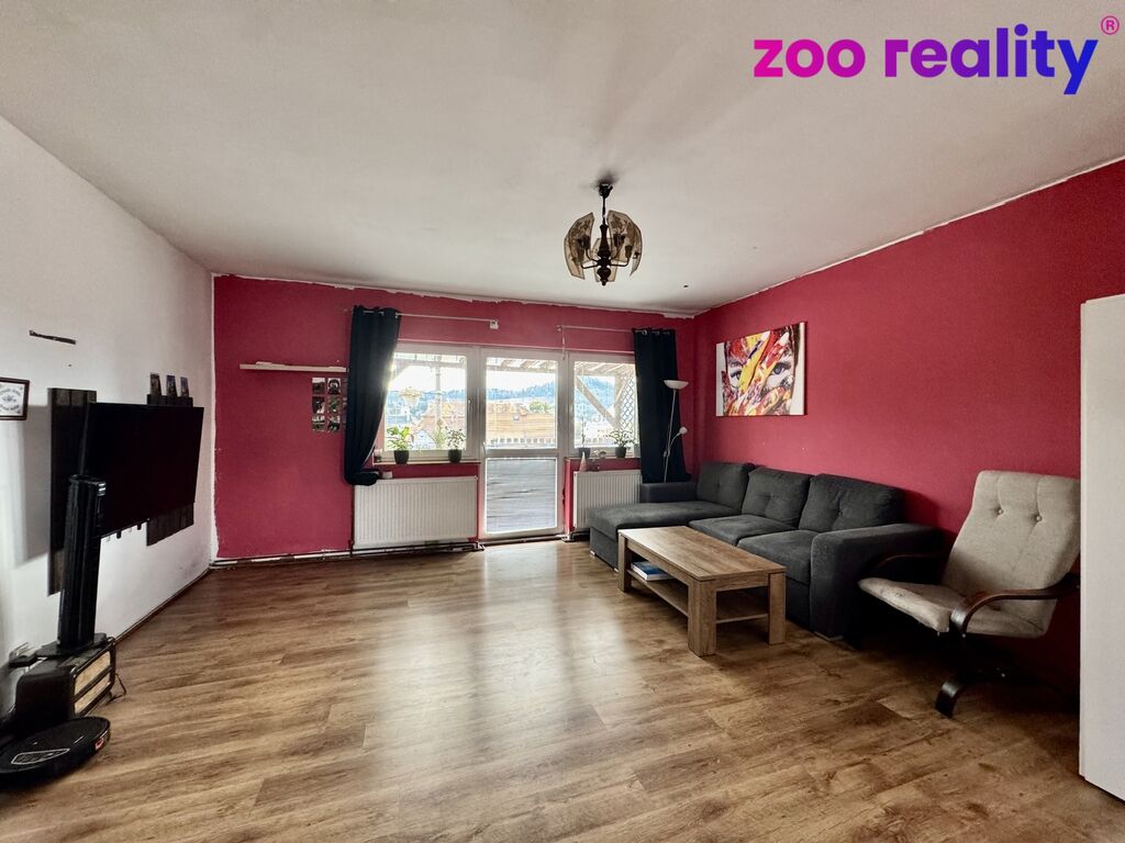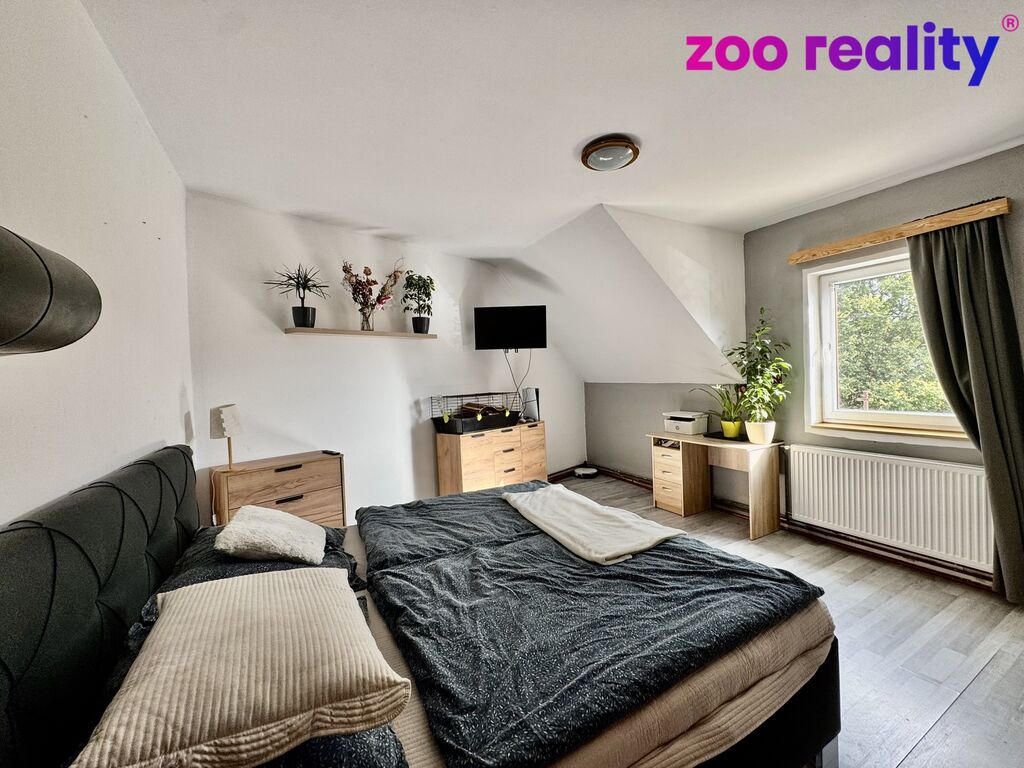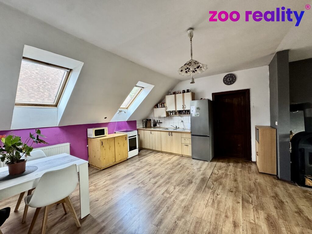 V přízemí domu najdeme nebytový prostor s plechovými vjezdovými vraty, dříve sloužící jako truhlářská dílna se zázemím, jsou tu další 2 místnosti, kotelna a toaleta. Dále pak vstupní předsíň s dřevěnými schody do obytného patra, kde je bytová jednotka o dispozici 3+kk (106 m2) s terasou (55 m2) s pěkným výhledem, na kterou se dostaneme z obývacího pokoje. V koupelně s vanou a umyvadlem je místo i na pračku, toaleta je oddělena.