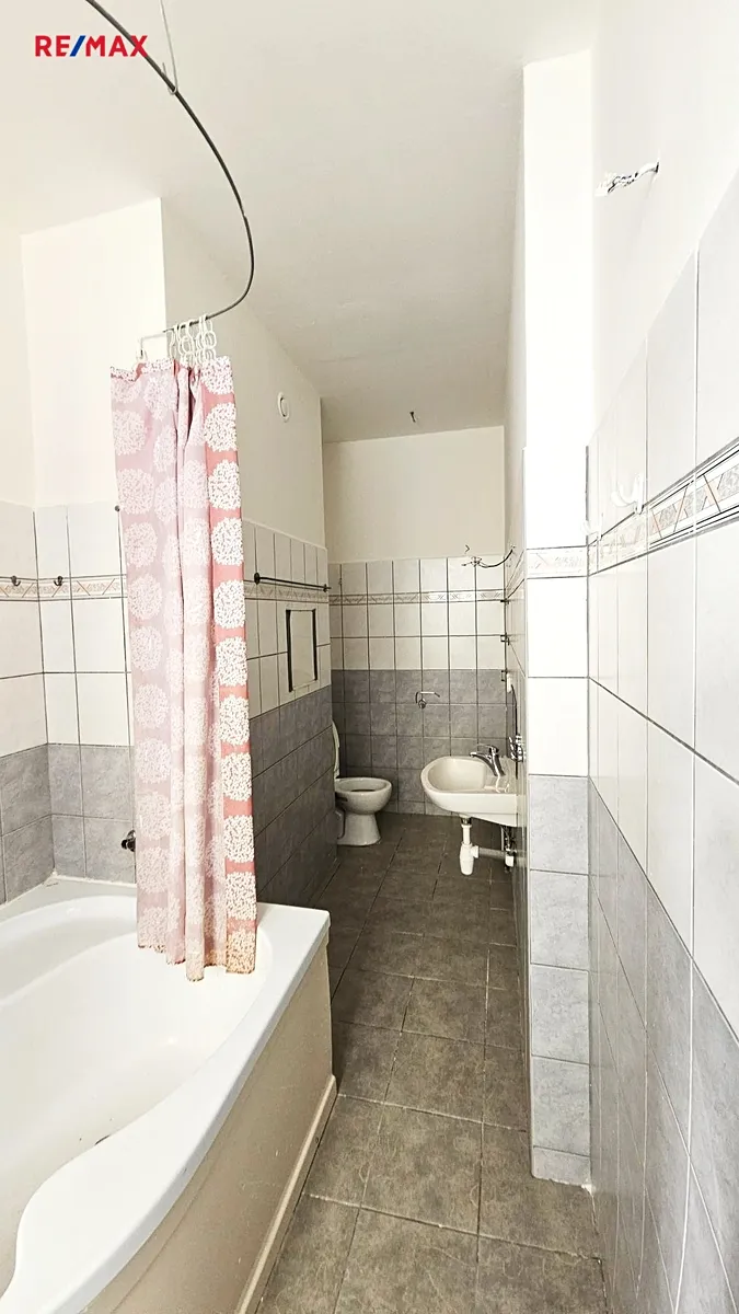 Koupelna je s rohovou vanou a toaletou. Vytápění a ohřev vody jsou ústřední etážové.