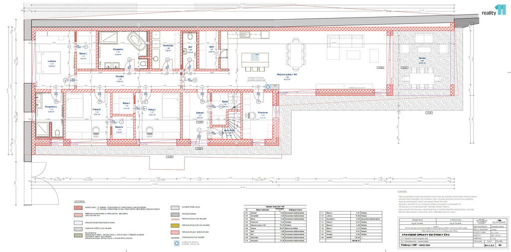 Dispozice domu: Obývací pokoj s kuchyňským koutem (70 m²) – dominantní prostor domu s možností instalace krbových kamen, přímý vstup na terasu a zahradu, ložnice (15 m²) se samostatnou šatnou, další 2 pokoje (každý 14 m²) – vhodné jako dětské pokoje, pracovna (9 m²) – ideální pro práci z domova, dvě koupelny (12 m² a 8 m²) a samostatné WC, technická místnost, spíž, chodba a několik šaten pro maximální komfort a úložný prostor. Dům bude díky promyšlené dispozici vyhovovat i náročnější rodině s dětmi. Technické řešení: Zdivo - Porotherm se zateplením minerální vatou 20 cm, Střecha: sedlový krov, pálená krytina Tondach v barvě antracit, Okna: plastohliníková, trojskla, Vytápění: tepelné čerpadlo vzduch–voda s podlahovým topením + krbová kamna v obývacím pokoji, Ohřev TUV: zásobník napojený na tepelné čerpadlo, Větrání: rekuperační jednotka s účinností minimálně 85 %. Energetická náročnost: projekt splňuje normy pro úsporné domy (ČSN 73 0540). Celková plocha pozemku: 1 023 m².