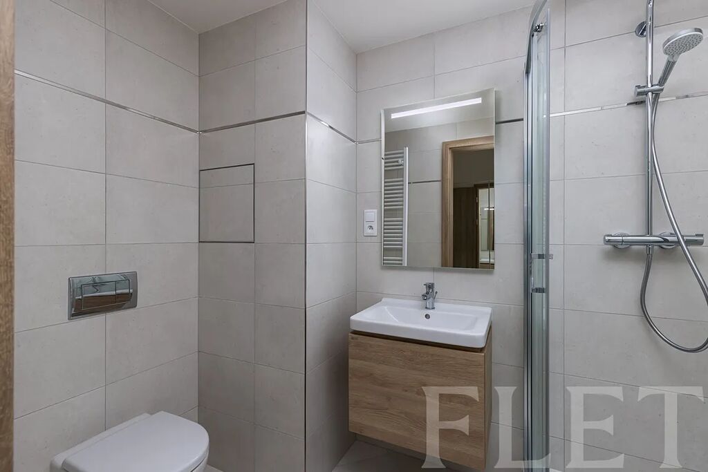Součástí koupelny se sprchovým koutem a toaletou je také pračka. Byt je vybaven moderním systémem větrání s rekuperací tepla i klimatizací. V předsíni je připravena zrcadlová skříň, která zajišťuje dostatek úložného prostoru pro vaše osobní věci. Součástí pronájmu je také sklepní kóje a parkovací stání přímo v domě.