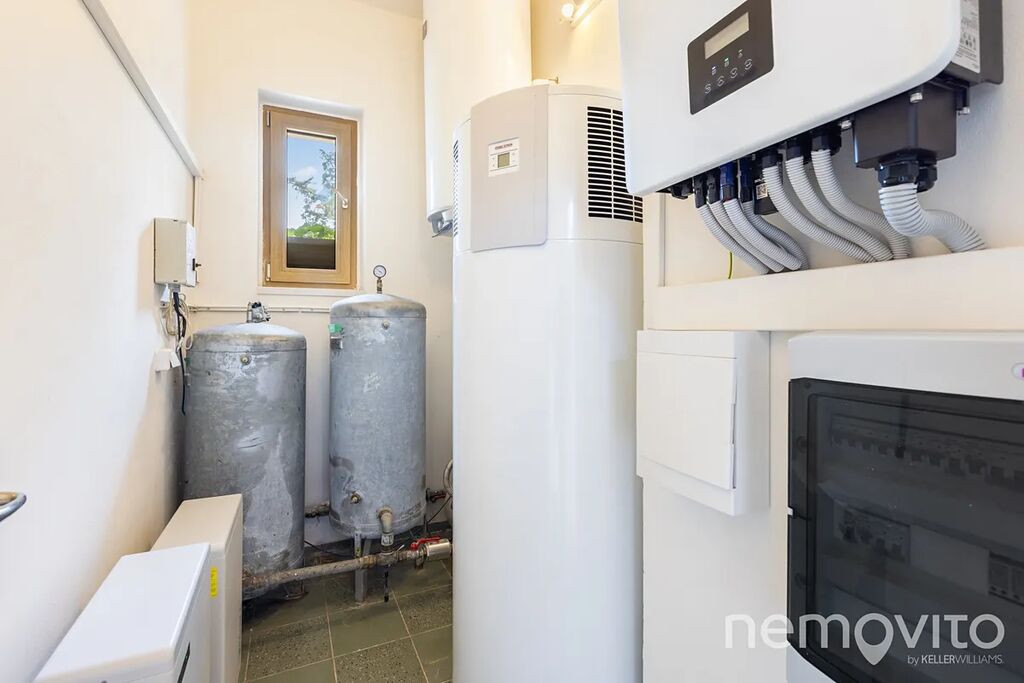Technické zázemí je umístěno u vstupní chodby - tvoří ho samostatná prádelna (8 m2), dále čtvrtá koupelna a také místnost s technologií (FVE, akumulační nádrž atd.). Garáž s vysokým stropem umožnila vybudování vestavěného patra pro zvětšení objemu úložného prostoru, který je dále doplněn o sklípek u bazénu.