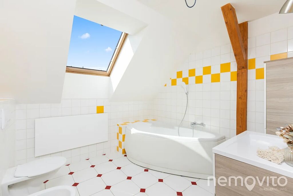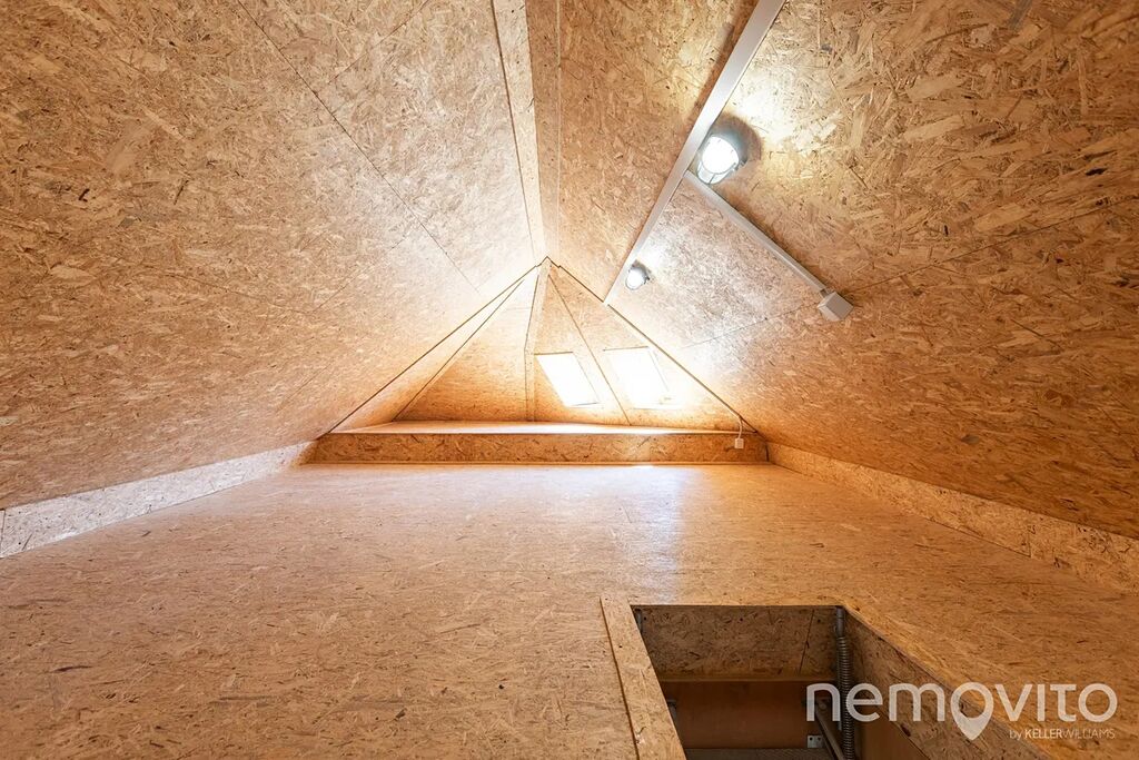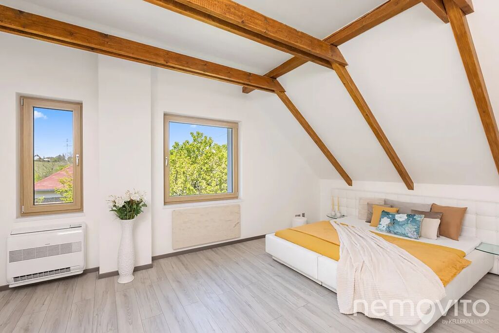 Dominantou je mimo zmíněného obýváku, ze kterého je výstup na terasu k bazénu, také hala se schodištěm, které propojuje obě podlaží. Všechny pokoje jsou nahoře, přičemž jedna z částí může fungovat zcela samostatně (vlastní koupelna, připojení na další kuchyni). V této ložnici s proskleným štítem je skutečně působivý výhled z balkonu, který je nad garáží. Následují dva menší pokoje a další sekce, která má vlastní koupelnu i šatnu. Nahoře jsou tak celkem 3 koupelny a možnost samostatného fungování dvou pokojů. Nechybí také velká, plně pochozí a čistá půda.