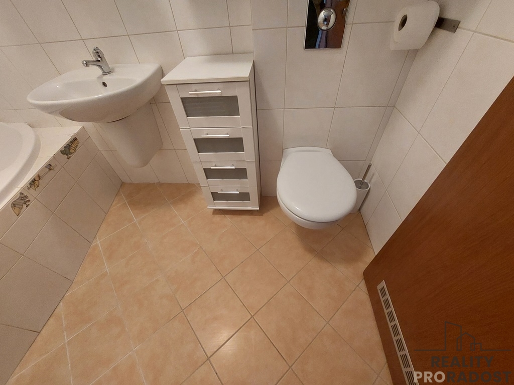 Zprostředkujeme pronájem velmi hezkého bytu 1+kk, o velikosti 30, 83m2 s předzahrádkou 35m2, nám. Svobody, Úvaly u Prahy. Byt je v 1 NP. s přímým vstupem bočními dveřmi na oplocenou předzahrádku, která patří k domu a je využívána pouze tímto bytem. Cihlový zateplený dům z roku 2006 je třípatrový bez výtahu s 5 bytovými jednotkami. Plastová okna, na podlaze dlažba. Byt se skládá ze zádveří s botníkem (lze umístit další šatní skříň), koupelny s rohovou vanou, otopným žebříkem, umyvadlem a WC. V koupelně umístěn plynový kotel na vytápění a bojler na ohřev vody. Obývací pokoj je spojen s kuchyní, která je oddělená barovým jídelním pultem se 4 židlemi. V obývací části konferenční a TV stolek, 2 matrace, velký úložný prostor ve vestavěné skříni se zrcadly. Kuchyňská linka vybavena lednicí s mrazákem, pračkou, el. varnou deskou a troubou, digestoří, nerez dřezem. Myčka není v současné době plně funkční. Sklep není k dispozici. Základní měsíční nájem 14 000,- + domovní poplatky včetně spotřeby vody, elektřiny a plynu činí 4 000,- měsíčně/ 1os., 2 osoby 5 000,- Kč, a budou nájemcem hrazeny měsíčně spolu se základním nájmem. Internet a pojištění bytu si hradí nájemce na své jméno. Celkem nájem 18 000,- Kč , provize 14 000,- Kč, vratná kauce 25 000,- Kč. Byt volný ihned, prohlídky po domluvě. Do doby dodání energetického štítku uvádíme třidu G. Byt se nachází v klidné rezidenční části Úval, v okolí rodinné domy, totožné bytové domy a dům s pečovatelskou službou včetně domova seniorů. V Úvalech dobrá občanská vybavenost, lékař, pošta, základní a mateřská škola, obchody, nákupní centrum Pražská, stanice nádraží v docházkové vzdálenosti. Moderní vlaky jezdí každých 15 - 30 min. Přímý spoj na Prahu Hlavní a Masarykovo nádraží vlakem cca 30 min. bez přestupu, autem, nebo autobusy Pražskou integrovanou dopravou k metru Černý most. Parkování před domem bez rezidenčních zón. V okolí zeleň, les, sportoviště, možnost relaxace v přírodě, přesto blízko u Prahy.