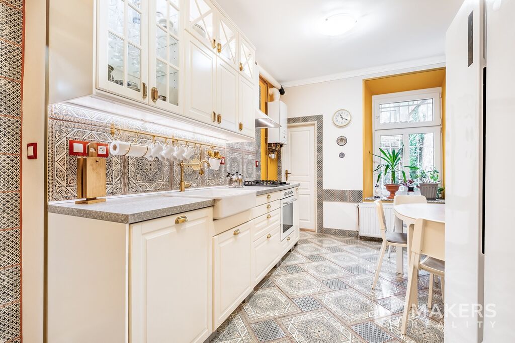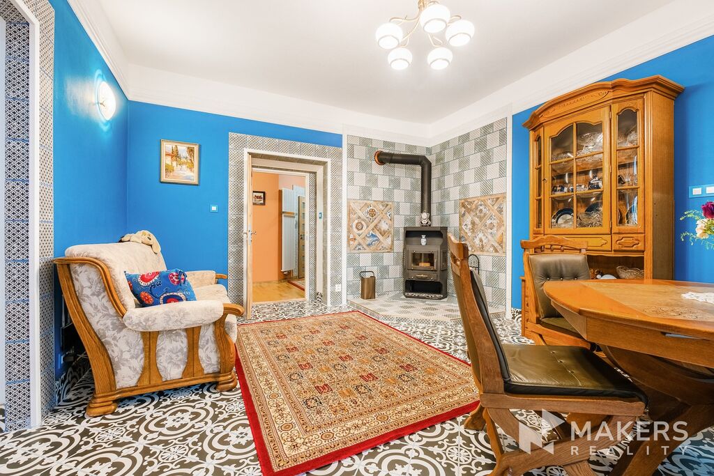 V obývacím pokoji je dominantou krb na dřevo, doplněný moderním vytápěním pomocí kondenzačního plynového kotle. Okna jsou vybavena dvojskly, sítěmi proti hmyzu a dekorativními mřížemi, čímž spojují bezpečí s estetickou hodnotou historického domu. Podlahy jsou kombinované: keramická dlažba a podlahy z přírodního dřevěného laminátu, dodávající interiéru vyvážený kontrast tepla a praktičnosti.
