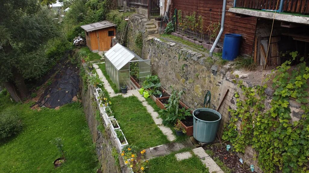 Pozemek 965 m² s rovinatou i mírně svažitou částí, vlastní zahradní domek, skleník, ohniště u řeky a možnost parkování