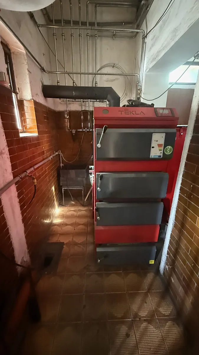 Automatický kotel na tuhá paliva (2020) + letní elektrický bojler, v bytě v přízemí krbová kamna.