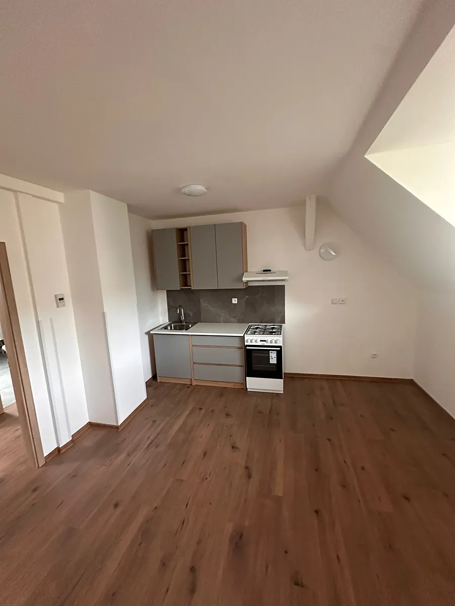 Nabízíme k pronájmu nově opravený podkrovní byt. Byt má obývací pokoj s kuchyňským koutem včetně kuchyňské linky a sporáku, ložnici, koupelnu se sprchovým koutem a WC. V galerii nad obývacím pokojem je další místnost využitelná jako pokoj nebo ložnice.