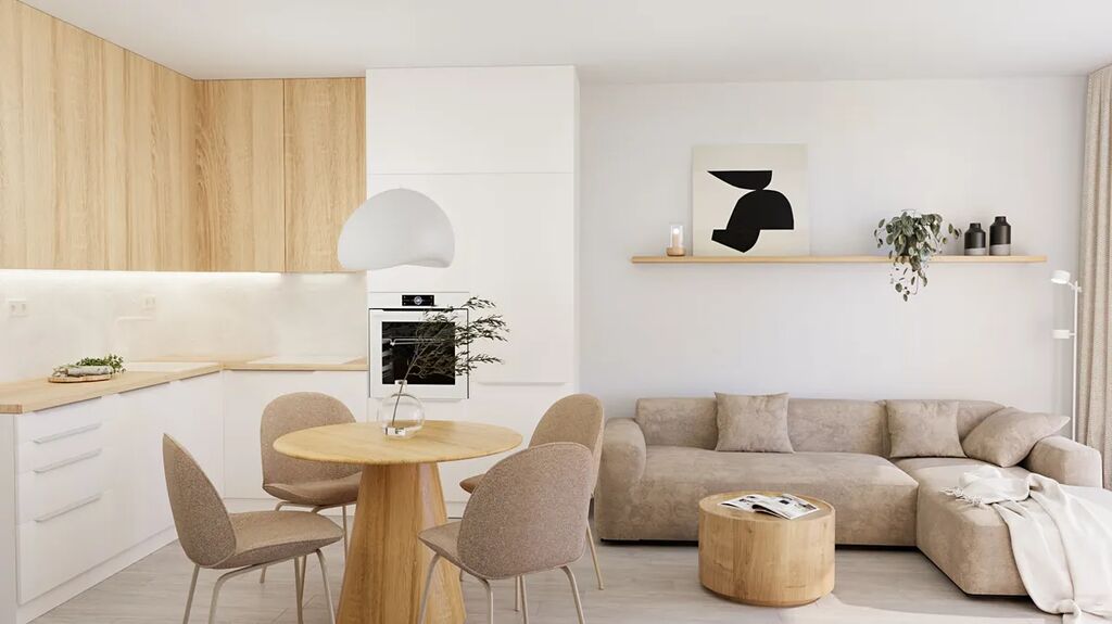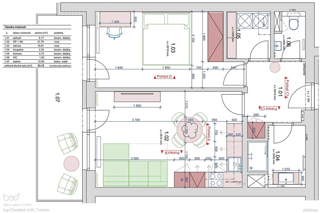 Byt má dispozici 2+kk a celkovou plochu 55 m2 + lodžii 13 m2 + sklep 6,3 m2. Byt bude vybavený kuchyňskou linkou včetně zabudovaných spotřebičů. (viz. vizualizace)