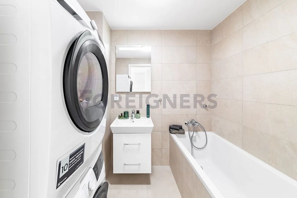 Koupelna s vanou, včetně umyvadlové skříňky, s podsvíceným zrcadlem, pračkou a sušičkou.