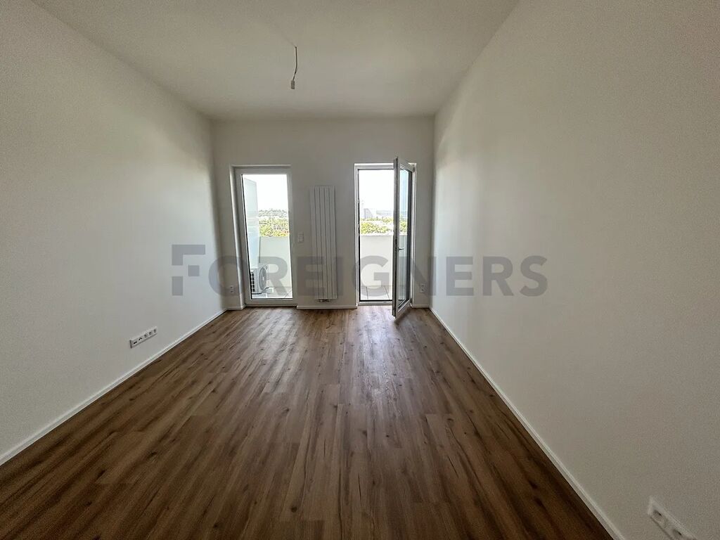 Hlavní část bytu tvoří světlý obývací pokoj s kuchyňským koutem a vstupem na balkon. Kuchyňská linka je vybavena vestavnými spotřebiči – lednice, myčka, indukční deska, digestoř, mikrovlnná trouba a dřez. V obytné části je prostor pro jídelní stůl, židle, TV skříňku a postel (bez matrace), nechybí ani vestavěné skříně a úložné prostory.