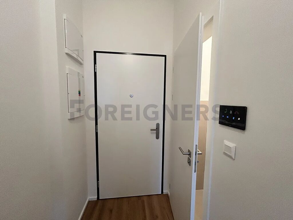 Po vstupu do bytu se nachází chodba, odkud je vstup do koupelny vybavené sprchovým koutem, umyvadlem se skříňkou, zrcadlem, toaletou a místem pro pračku se sušičkou.