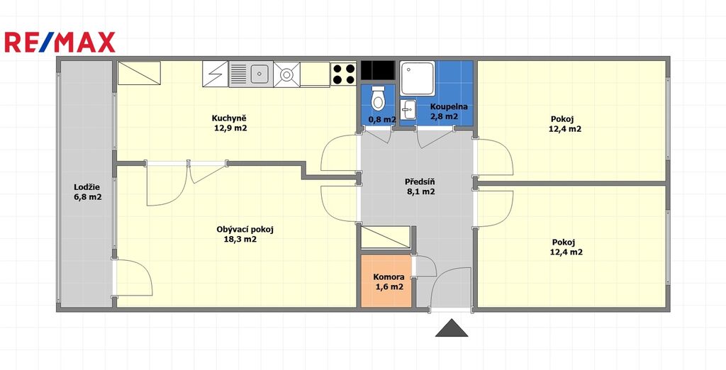 Z obývacího pokoje (18,3 m2) vede přístup na lodžii (6,80 m2), která je zasklená a nabízí příjemný prostor k odpočinku.