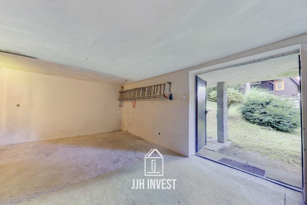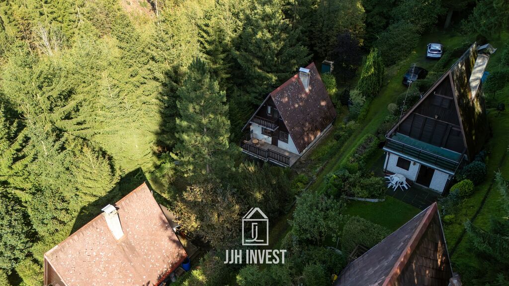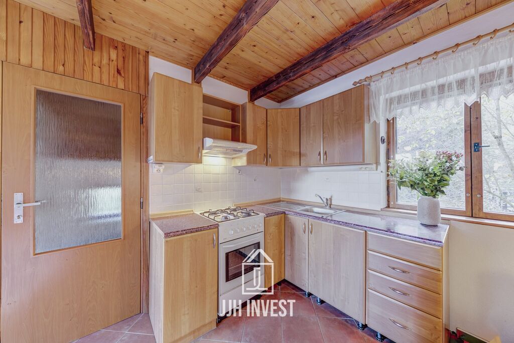 Stavba stojí na pevných betonových základech, horní část je řešena jako dřevěná konstrukce. Dispozice zahrnuje obývací pokoj s krbem, kuchyni, dvě ložnice a praktické úložné prostory. Ve spodním patře je koupelna s toaletou a dílna, která poslouží jako zázemí pro kutily nebo sklad. Chata je určena k rekreaci od jara do podzimu.