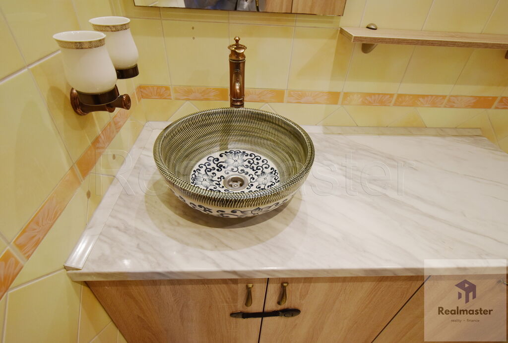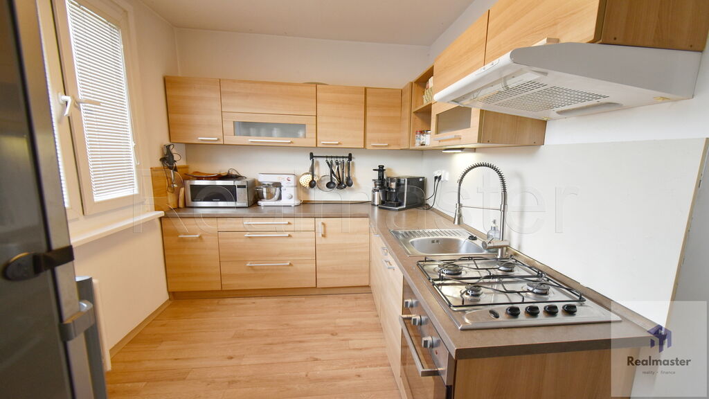 Rekonstrukcí prošla koupelna a kuchyňská linka. Nové jsou i podlahy v celém bytě.