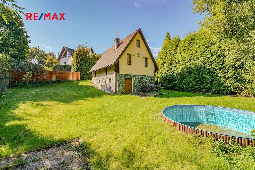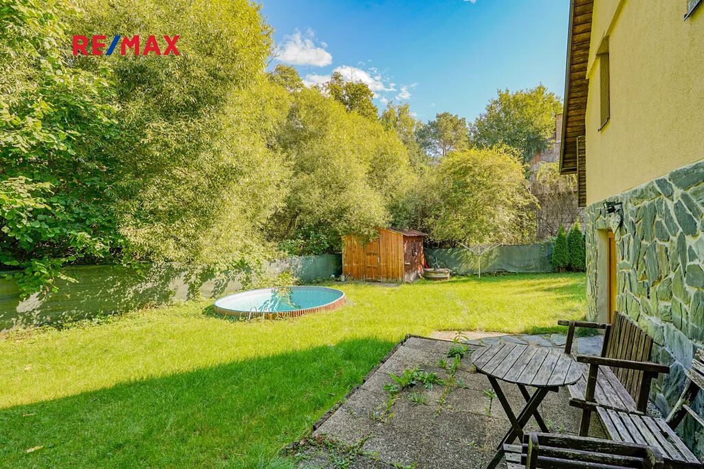 Dům je rozdělen do tří podlaží, v 1. podlaží se nachází vstupní chodba a místnost kterou lze využít například jako dětský pokoj. Ve 2. podlaží se nachází obývací pokoj s krbem, kuchyní a koupelnou se sociálním zázemím. Ve 3. podlaží nalezneme další pokoj který lze využít například jako dětský pokoj, ložnici a nebo pracovnu. Dále je na zahradě k dispozici polozapuštěný bazén a domek pro zahradní náčiní. Díky vysokým vzrostlým stromům po obvodu pozemku nabízí zahrada dostatek klidu a soukromí. Dům prošel 10 let zpět kompletní rekonstrukcí včetně zateplení, je vybaven plastovými okny s dvojskly, elektroinstalací kompletně v mědi, plovoucími podlahy a střechou z plechové taškové krytiny. Vytápění je zde řešeno pomocí krbu a ohřev vody pomocí elektro bojleru.