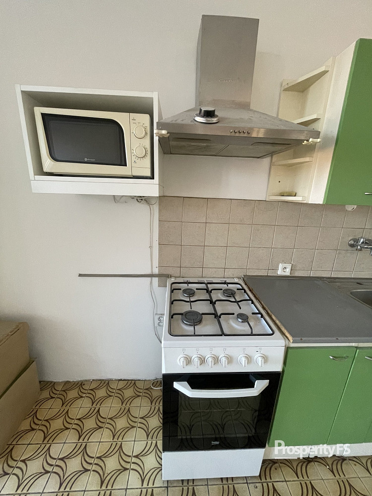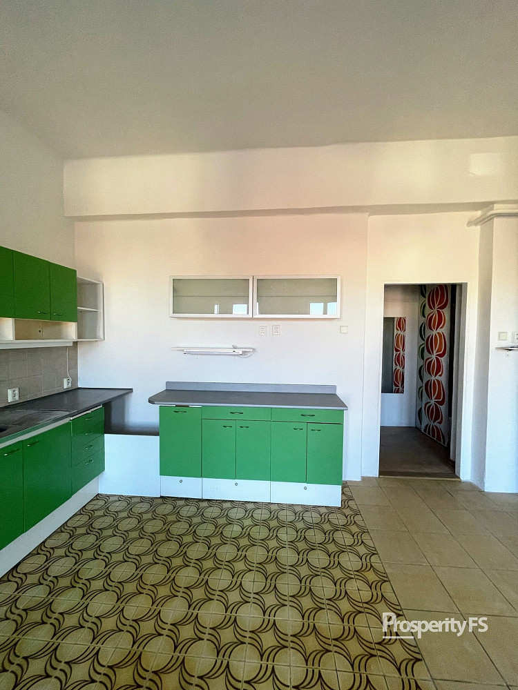 V bytě zůstává částečné vybavení (židle, stoly, skříňky, poličky).