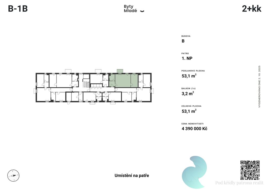 Nabízený byt č. B-1B o dispozici 3+kk, výměře 53,1 m2 a balkonem 3,2 m2, se nachází v přízemí budovy B. Disponuje vstupní chodbou, koupelnou, obývacím pokojem s kuchyňským koutem a neprůchozím pokojem.