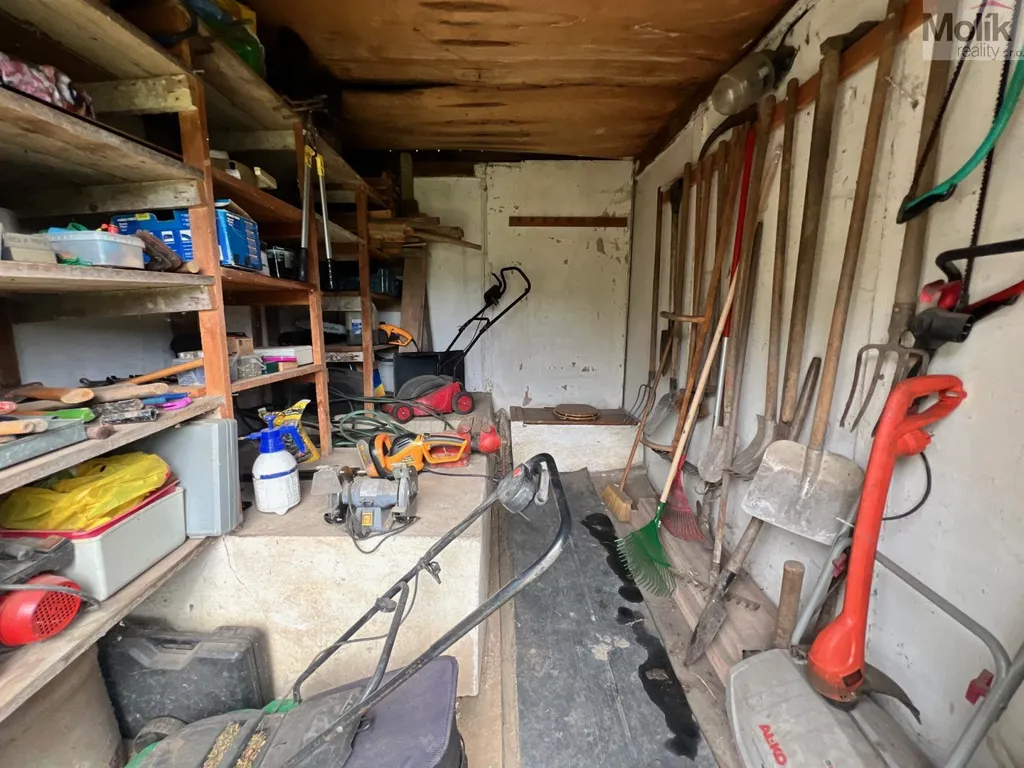 Součástí pozemku je také kůlna s novou střechou (2024), částečně podsklepená, kde zůstává kompletní vybavení od sekaček a křovinořezu, přes elektrickou pilu až po drtič větví a další nářadí. V kůlně je umístěn i suchý záchod.