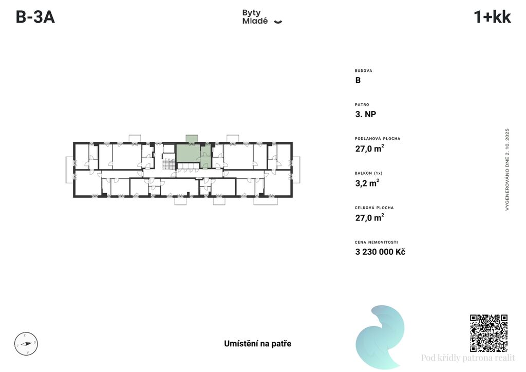 Nabízený byt č. B-3A o dispozici 1+kk, výměře 27 m2 a balkonem 3,2 m2, se nachází v prvním patře budovy B. Disponuje vstupní chodbou, koupelnou a obývacím pokojem s kuchyňským koutem.